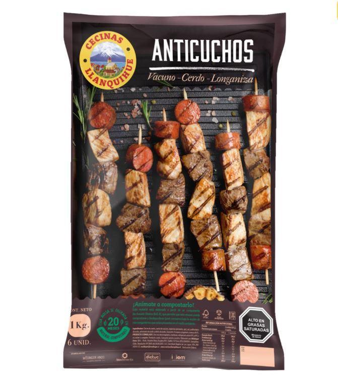 Anticuchos palito artesanal (cada bolsa contiene 6 unidades, 1 kg. aprox.). Duración: 6 meses congelado a menos 18ºC. Una vez descongelado no volver a congelar. PRODUCTO CRUDO. Consumir previa cocción.